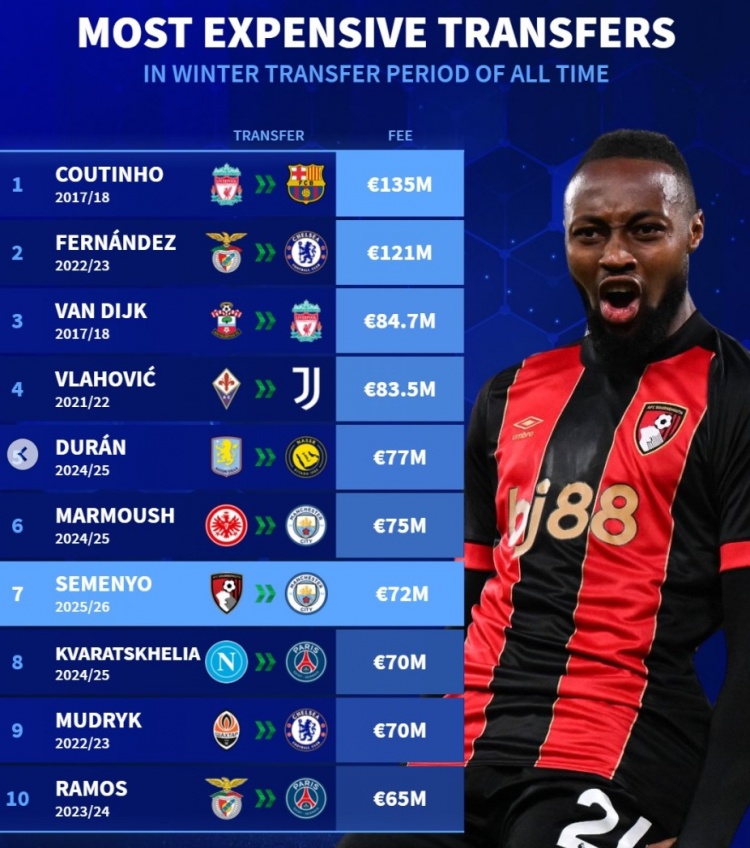 1月9日讯 曼城已经官宣签下塞梅尼奥,德转数据统计显示他也是历史第7贵的冬窗引援。
