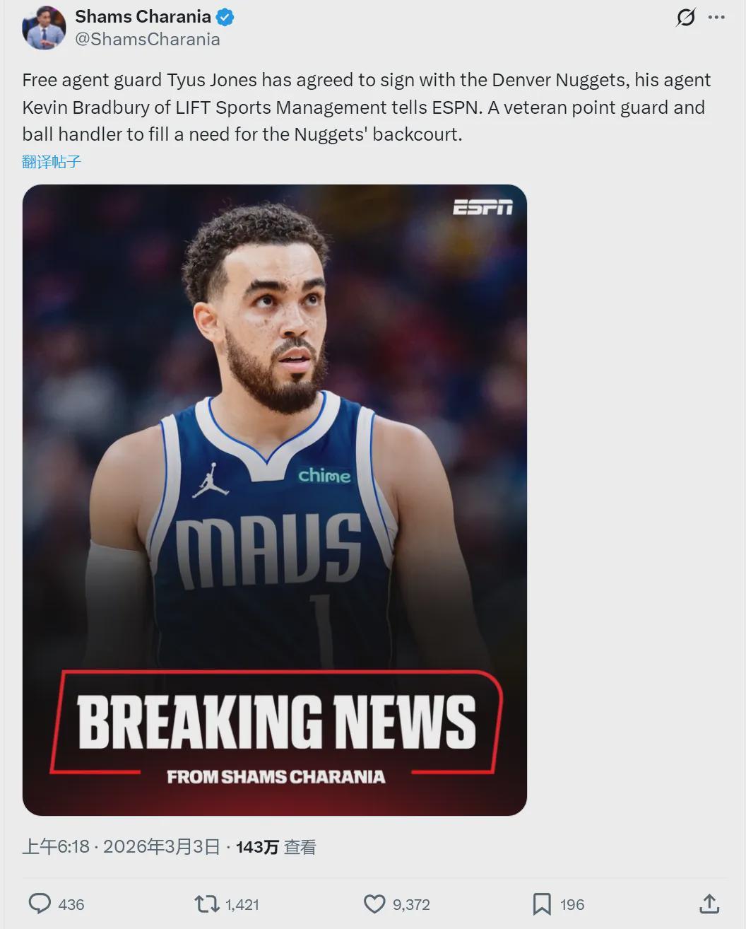 北京时间3月3日,据NBA名记Shams报道,泰厄斯-琼斯同意加盟掘金,填补掘金后场的空缺。由于戈登和沃特森长期缺阵,掘金本来想签一个锋线,比如凯尔-安德森或者米德尔顿。但前者已经加盟森林狼,后者并未被独行侠买断。